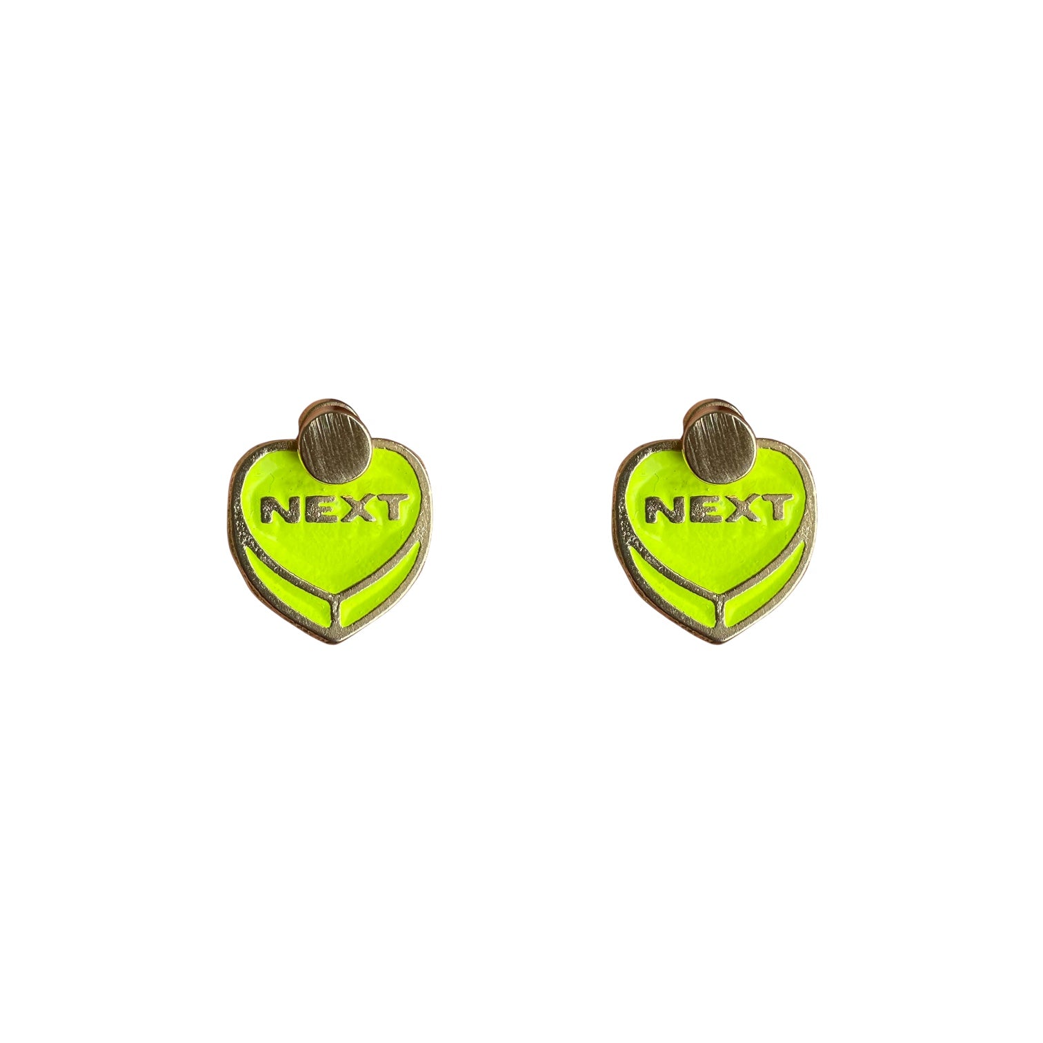 Topo y corazón en zamac con baño en oro de 24 kt y pintado a mano con pinturas que alumbran en neón con luces UV. El topo es hipoalergénico y mariposa en acero inoxidable.