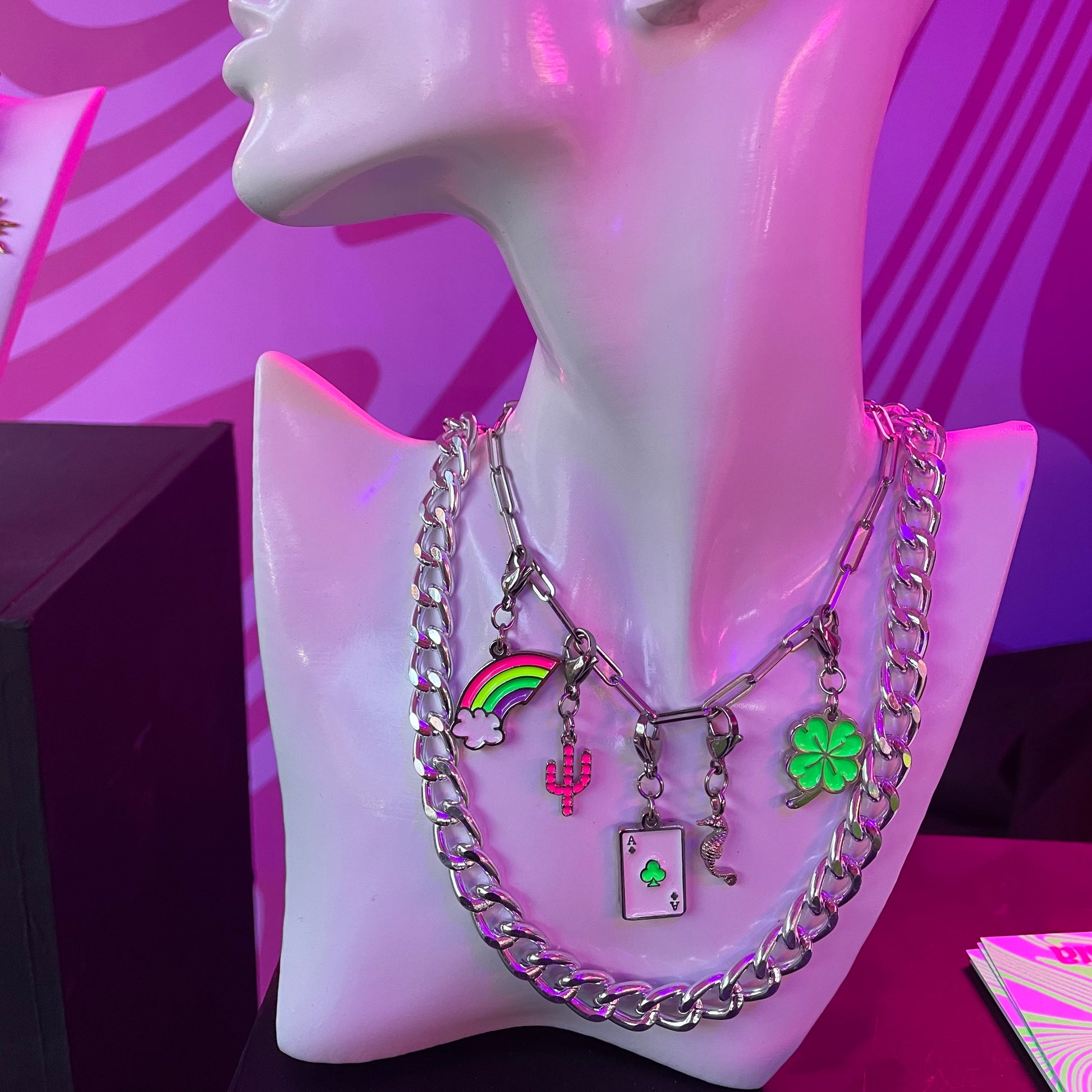 Cadena y apliques en acero niquelado. Placa en zamac con acabado níquel y pintado a mano con pinturas que alumbran en neón con luces UV.