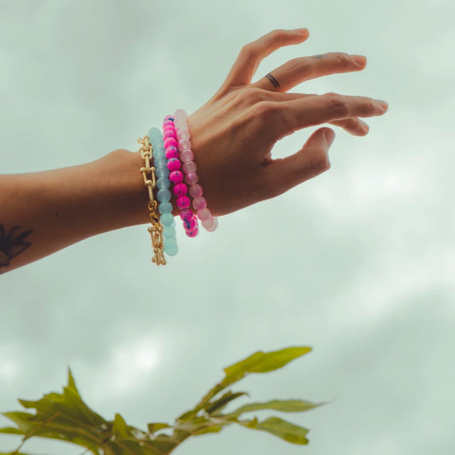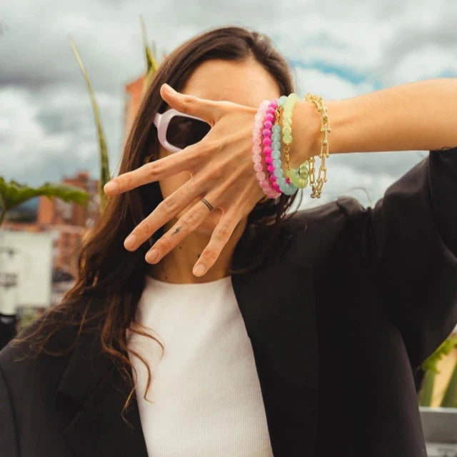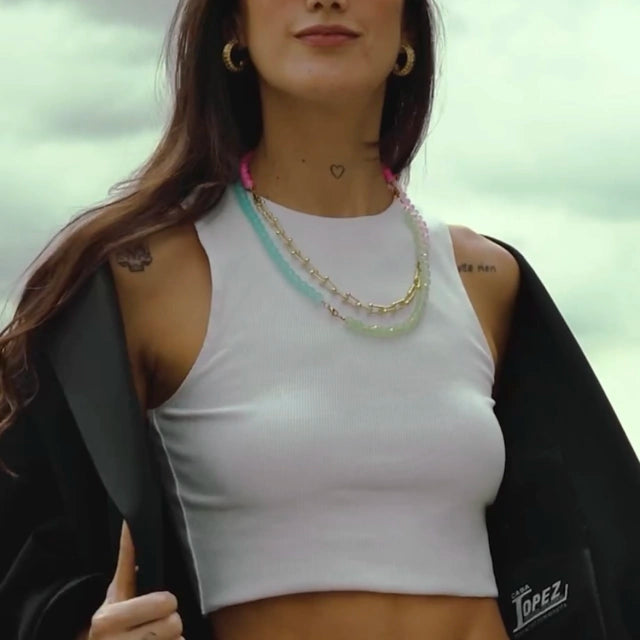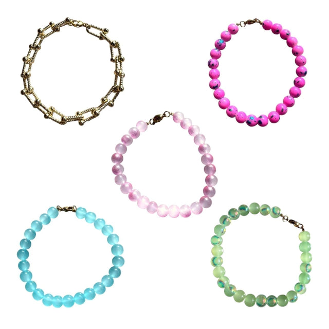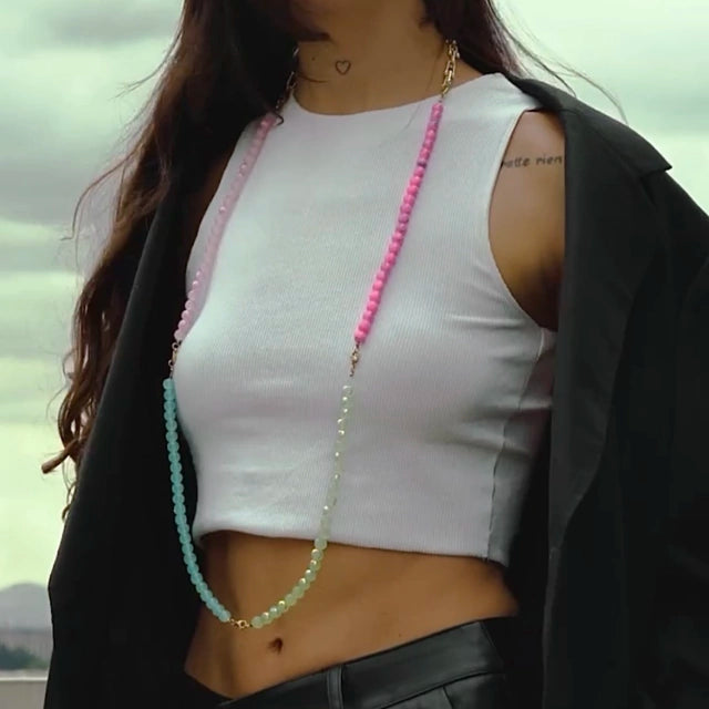 Este set de 5 mitades de collares te da el poder de crear, mezclar y transformar. Úsalas solas como pulseras, o júntalas para formar collares únicos que se adapten a tu mood. Colores, texturas y materiales que puedes combinar a tu antojo, creando composiciones únicas cada vez. Las posibilidades son infinitas, y cada look lo decides tú.